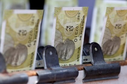 Indian 20-rupee currency notes are displayed at a roadside currency exchange stall…
