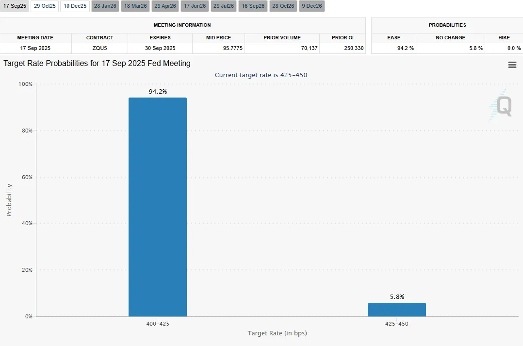 The CME FedWatch tool now shows a 94.2% probability of a 25 bps cut at the September 17 FOMC meeting—up sharply from 84.5% in our August 12 forecast.
