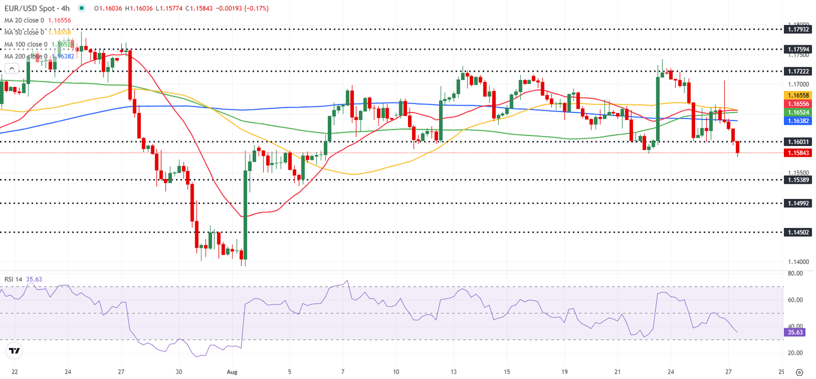 EUR/USD stays under selling pressure following Tuesday’s modest recovery and trades at its lowest level in three weeks below 1.1600 in the European session on Wednesday. The pair’s technical picture highlights a buildup of bearish momentum.