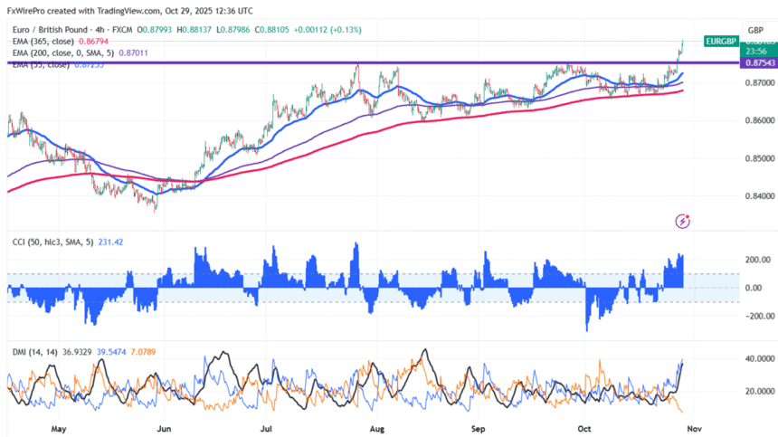 EURGBP hits a 2.5-year low on board-based Pound sterling. As long as support 0.8750 holds, intraday bias is positive. Currently trading at 0.87536, it reached an intraday high of 0.87650.