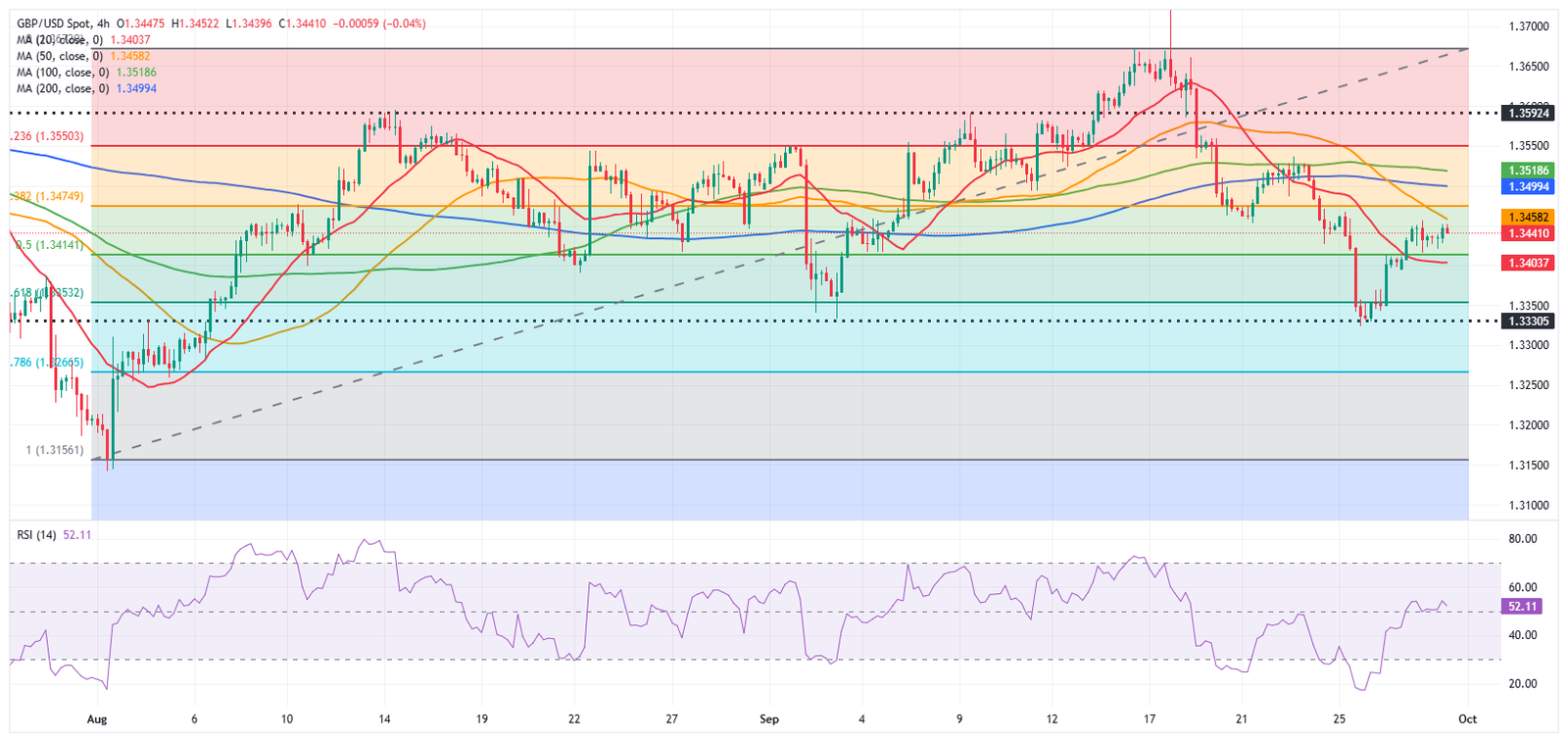 After closing with small gains on Monday, GBP/USD holds its ground and trades slightly below 1.3450 in the European session on Tuesday. Markets cling to a cautious stance as investors grow increasingly concerned over a possible government shutdown in the US.