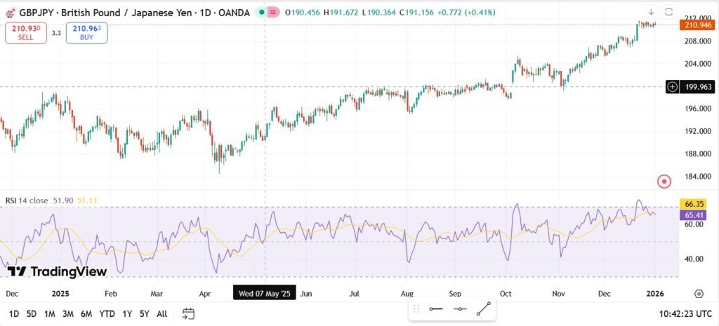 On the daily chart, GBP/JPY continues to post higher highs and higher lows, confirming the broader bullish trend. The pair recently traded around ¥210.90, consolidating just below resistance after a strong run-up from mid-2025.
