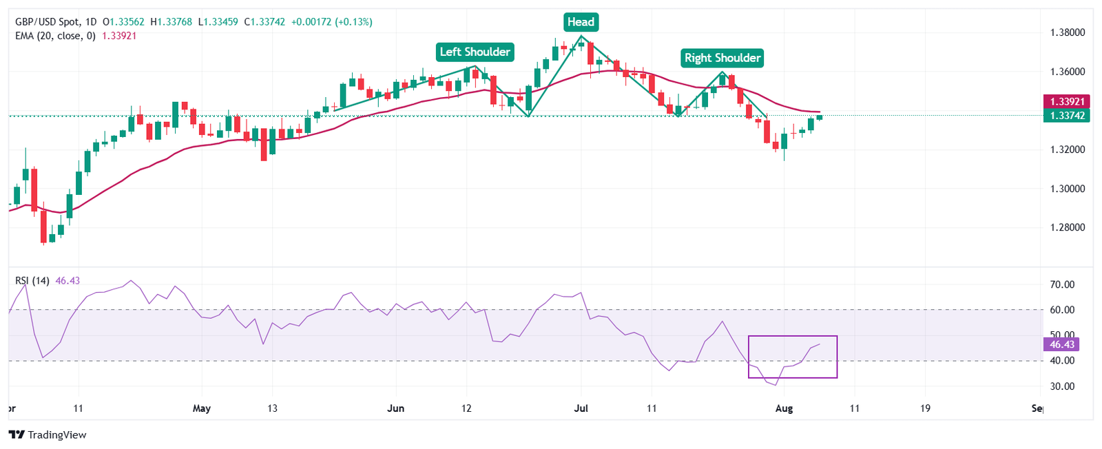 The Pound Sterling extends its winning streak and jumps to near 1.3380 against the US Dollar on Thursday. The GBP/USD pair rises near the breakdown zone of the Head and Shoulders (H&S) chart pattern, which is around 1.3376. The Cable has aims to revisit the 20-day Exponential Moving Average (EMA), which trades around 1.3390.